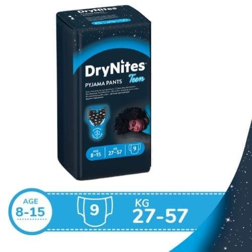 Huggies DryNites Pyjama Pants help children through the bedwetting stage by offering the best overnight protection helping your child stay dry and confortable throughout the night. Designed to be worn discreetly under nightwear, DryNites Pyjama Pants can be put on and taken off like real underwear. Because they’re discreet and underwear like, children can feel more confident and independent at bedtime, for dry nights either at home or nights away. They feature a thin super absorbent pad that draws wetness away from the skin.