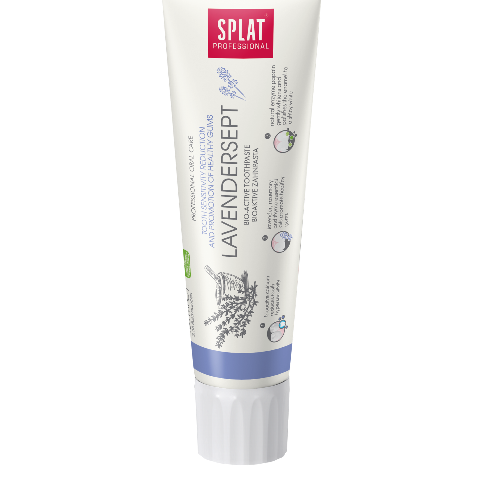 SPLAT PROFESSIONAL LAVENDERSEPT® is an effective total care toothpaste with lavender, rosemary and thyme essential oils. Lavender & Thyme essential oils promote gums health along with Zinc ions (Zinc Citrate), which reliably protect against tooth decay and freshen breath. Rosemary essential oil provide long-term feeling of coolness and freshness in combination with Menthol. Innovative Sp.White System polishes the enamel to a brilliant shine and promotes oral care health – natural papaya enzyme (Papain) and rounded polishing particles of silica help to remove surface stains and dental plaque, Polydon (PVP)- film-forming component, covers teeth with a protective film, effectively contributing to long-term cleansing. Potassium whitening salt (Tetrasodium Glutamate Diacetate) contributes to efficient cleansing. Dicalcium Phosphate Dihydrate is a soft abrasive, which has a remineralizing effect and reduces tooth hypersensitivity.