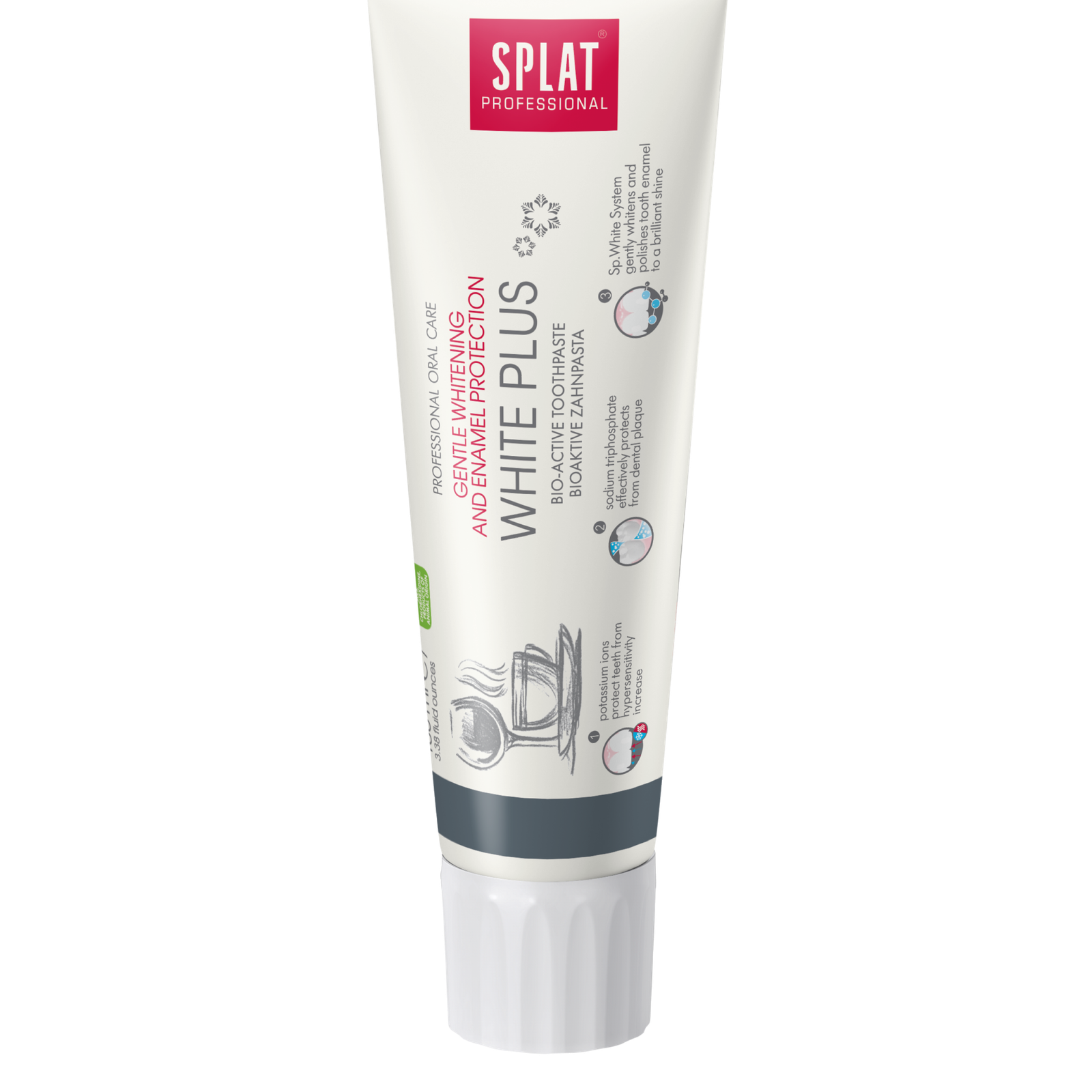 SPLAT PROFESSIONAL WHITE PLUS is a toothpaste with our whitening Sp. White System®, which polishes the enamel to a brilliant shine – natural papaya enzyme (Papain) and rounded polishing particles of silica help to remove surface stains and dental plaque, Polydon (PVP) – film-forming component, covers teeth with a protective film, effectively contributing to long-term cleansing. Tripple Whitening System (System of Triple Action Phosphate) breaks up coffee, tea and red wine stains, which effect teeth colour, gently polishes tooth enamel: